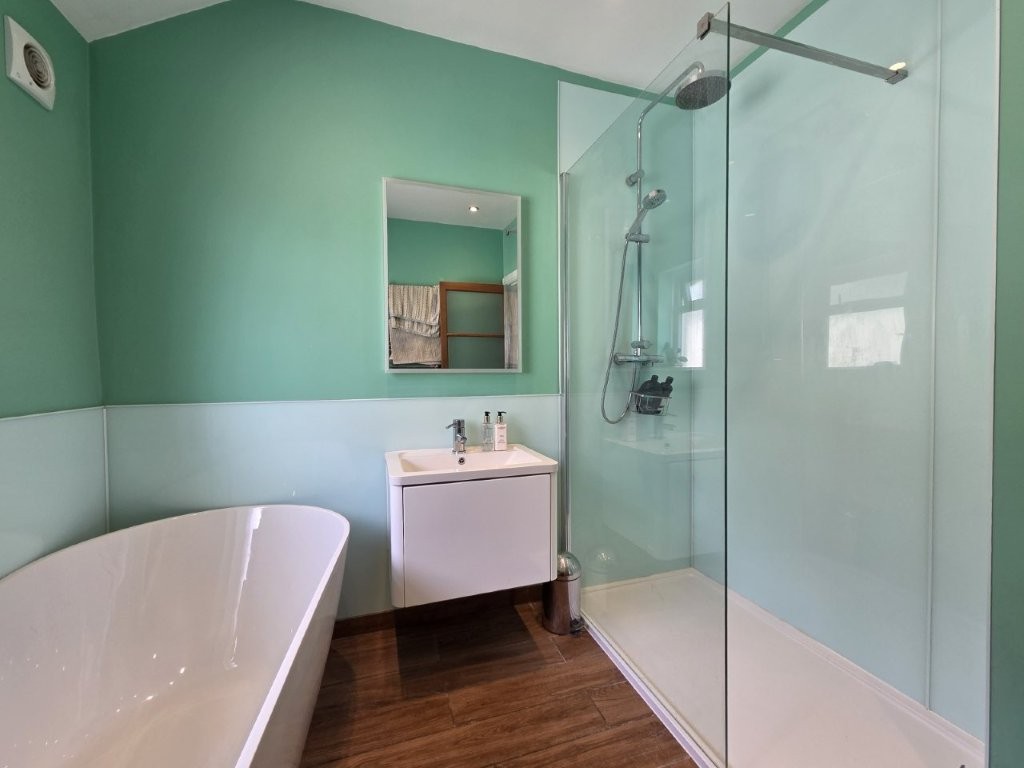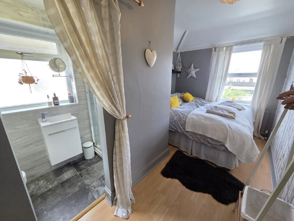 Double bedroom, with wood-effect flooring, rear-aspect window and en-suite tiled shower, w/c and hand washbasin.