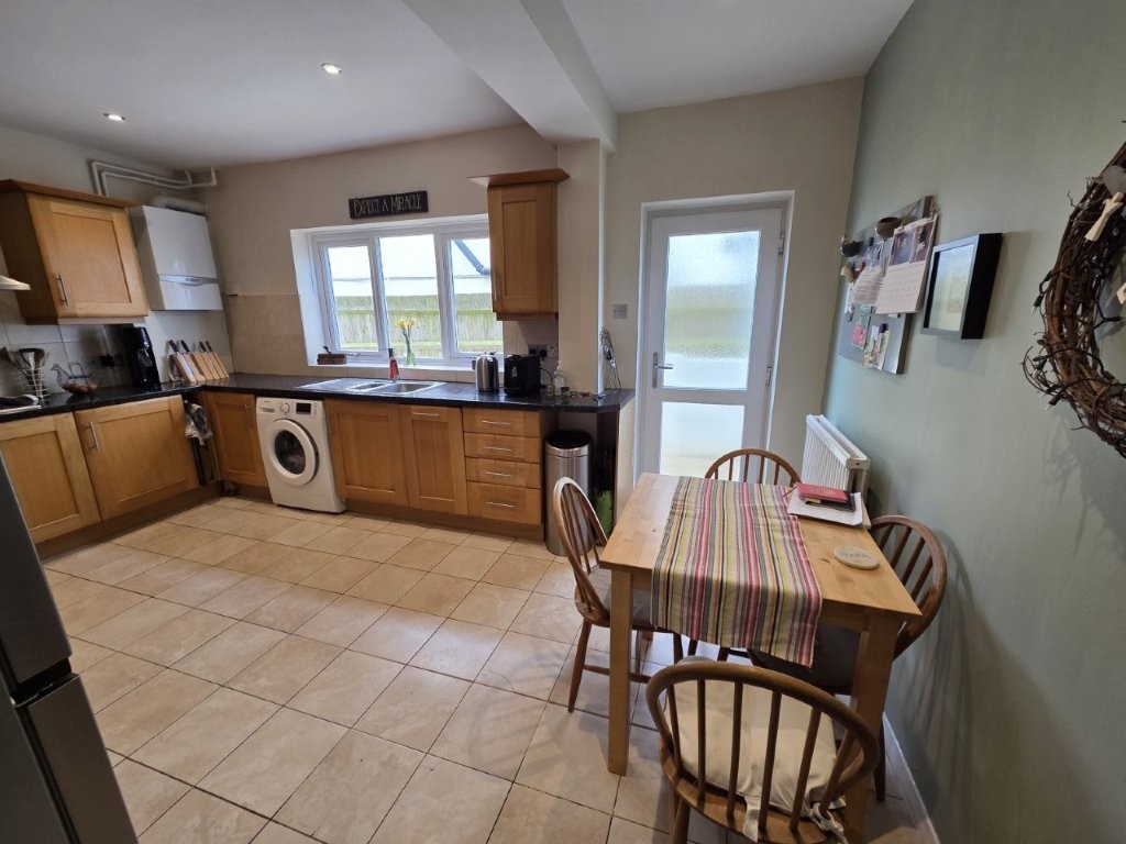 Fully equipped separate kitchen with space for a breakfast table. Tiled flooring and splashbacks with base and wall-mounted units. It comes with integrated oven, microwave and grill, slimline dishwasher and freestanding washing machine, gas hob with extractor hood and freestanding American style fridge freezer. The kitchen benefits from access to the side of the property leading directly to the front driveway.