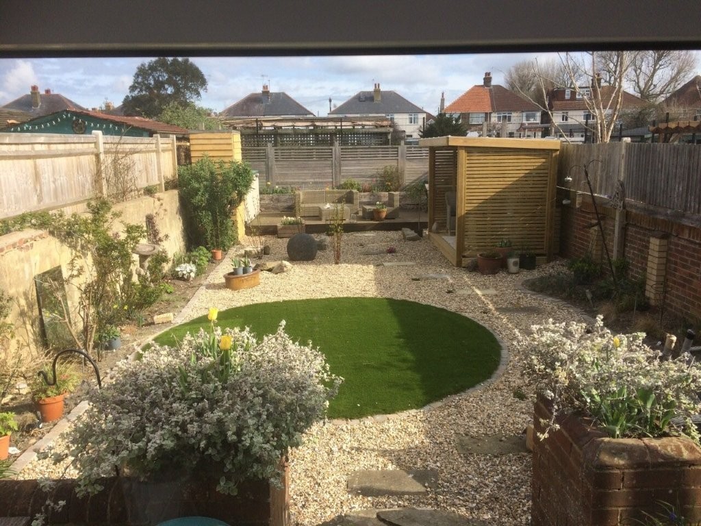 The rear garden is pebbled with a feature lawned area, raised seating area, arbour and patio.