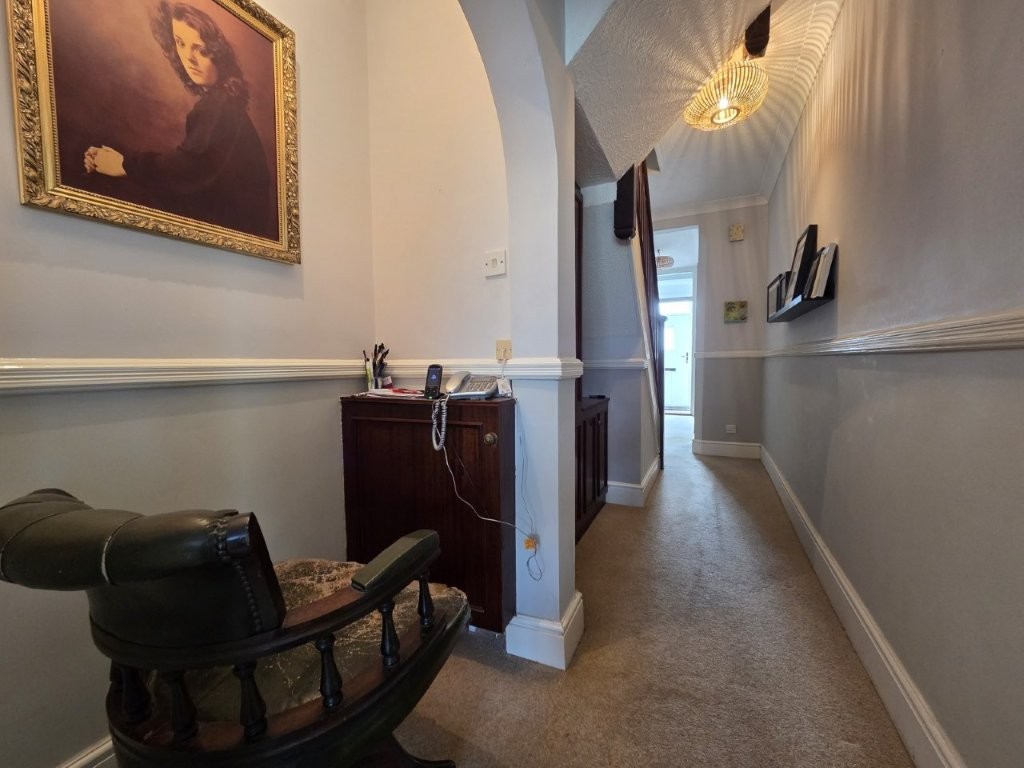 Corridor leading to kitchen and rear of the property, with built-in storage and stationary space in alcove.